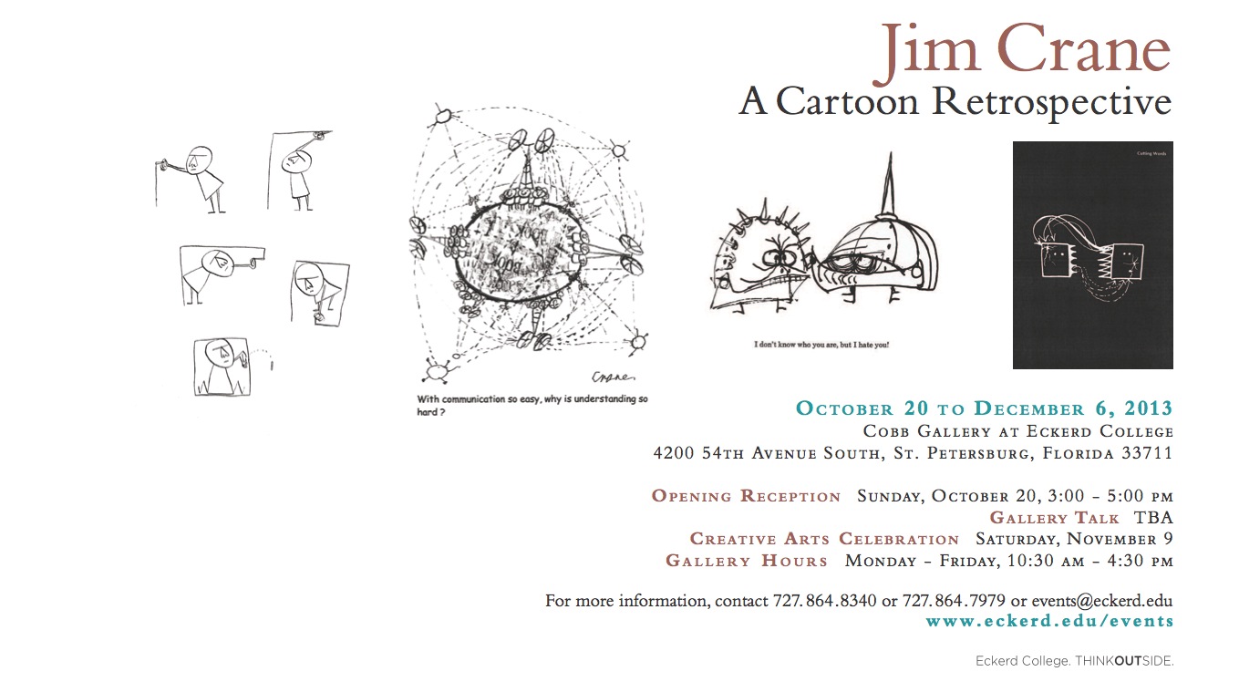 Father, Friend, and Artistic Mentor Jim Crane is having a retrospective of his cartoon work. The opening is this Sunday, October 20th, 2013 in St. Petersburg, Florida.