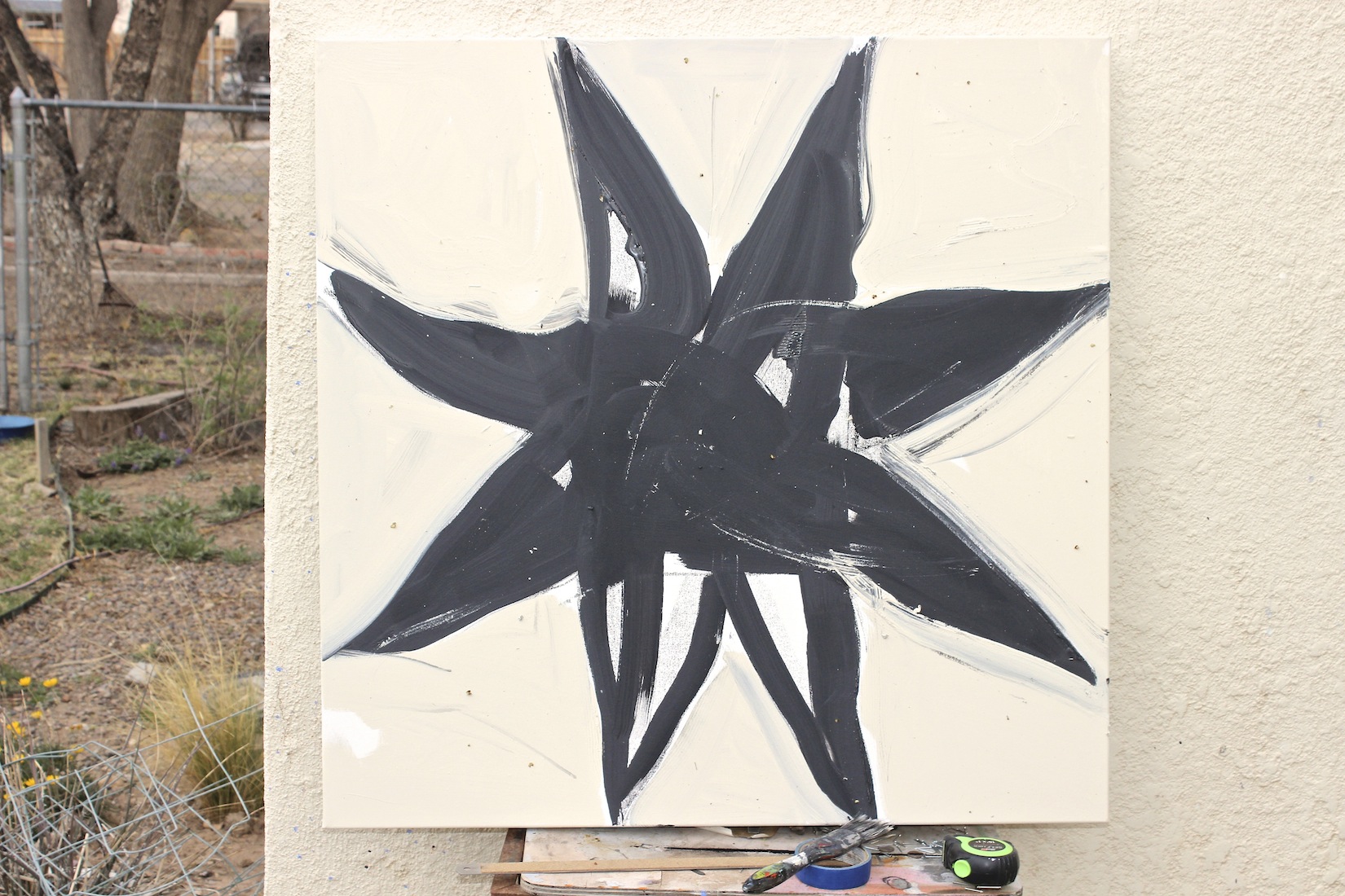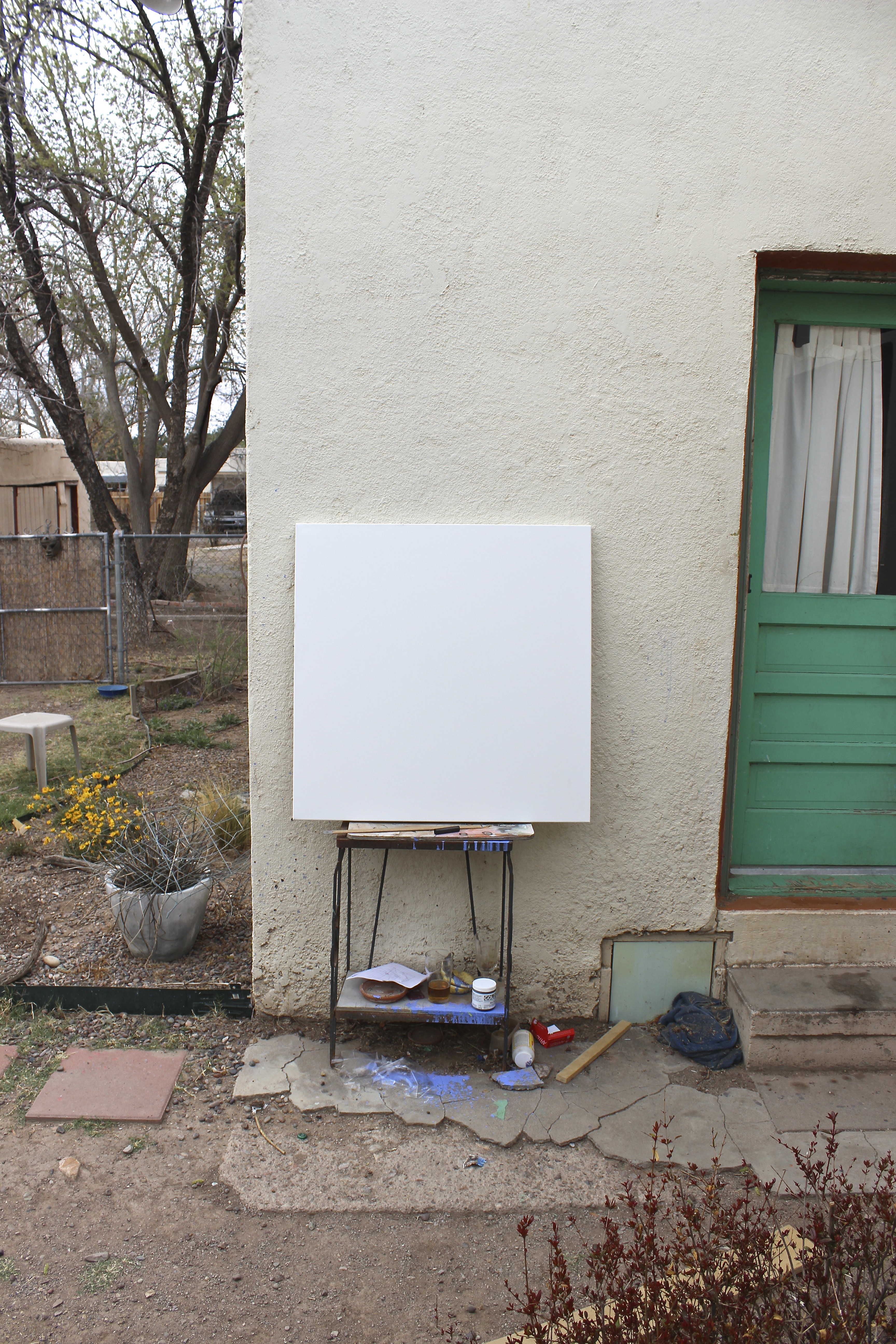The Void. I usually stretch my own and play off of the raw canvas and uneven brushy gesso. This commercial stretched-and-gessoed canvas was very reasonably priced at a new store on Main Street. Thus, I supported the locals, and it helps to get on with it. First lesson of painting — “Don’t fear the canvas.” This piece was entirely created in “Studio One” (the back yard) as seen in the background: