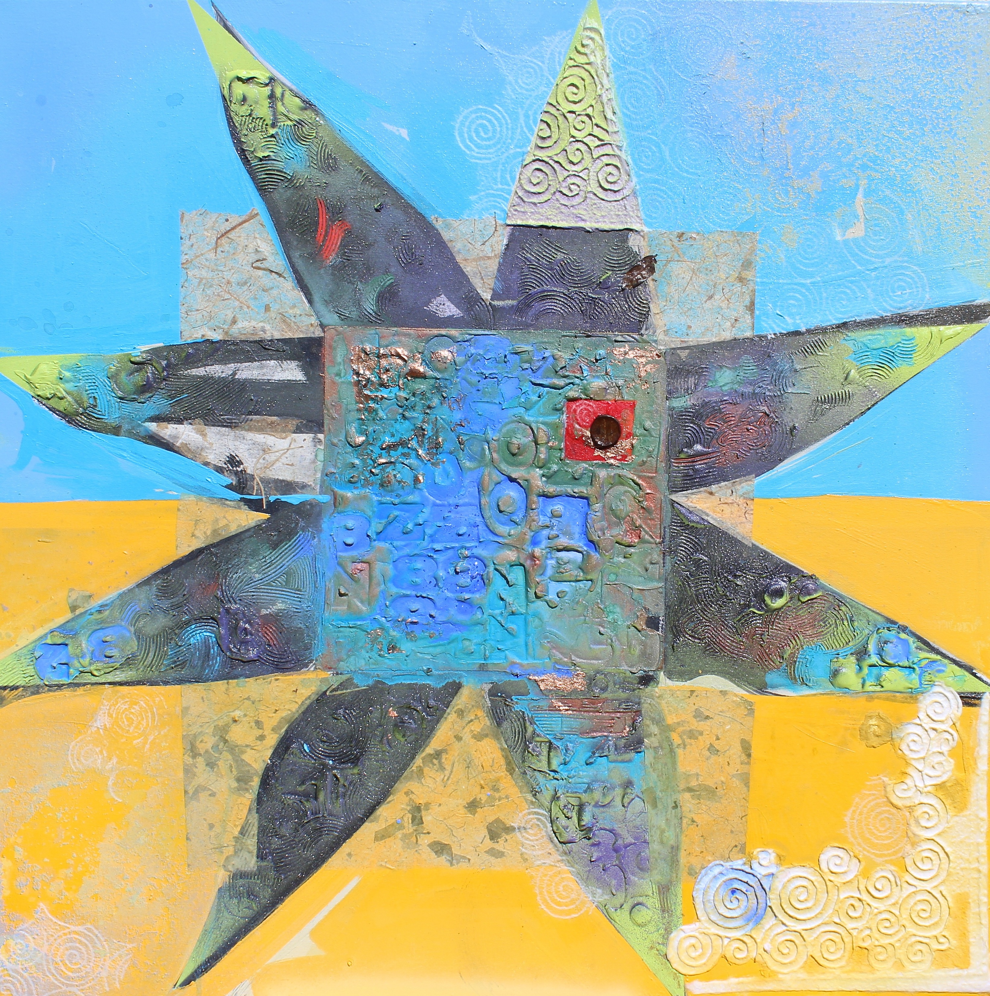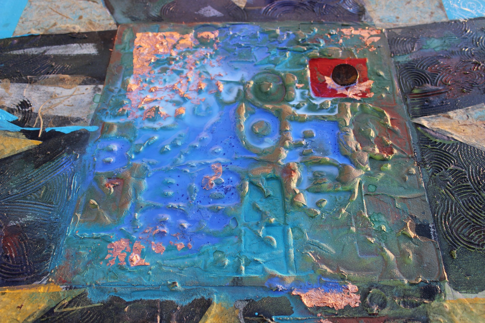 I’ve added “copper” metal leaf to the center. I dropped the leaf onto thinned clear medium. I let one corner square hold and “disintegrated” the rest with a brush. More flooding with Ultra Marine. I’ve placed a rusty bottle cap on the red “seal” area for placement consideration: