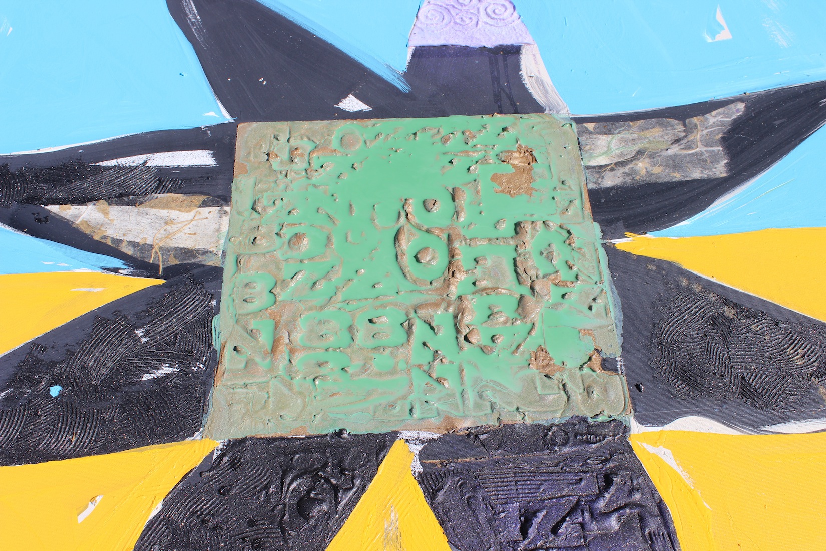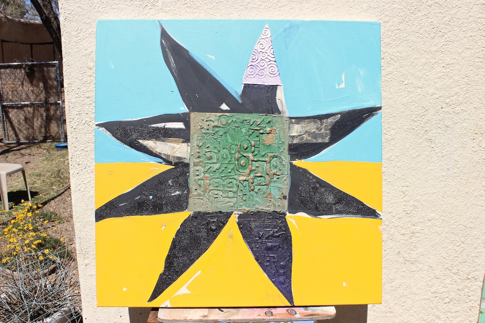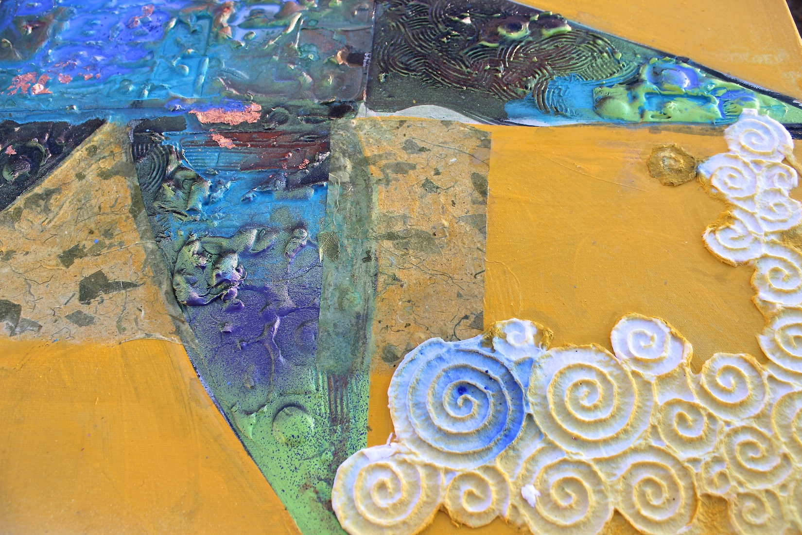 I have wet the yellow and blue corner areas with thinned clear medium and misted them with enamel spray. Misted water will break up the surface giving me a mottled, fairly subtle surface: