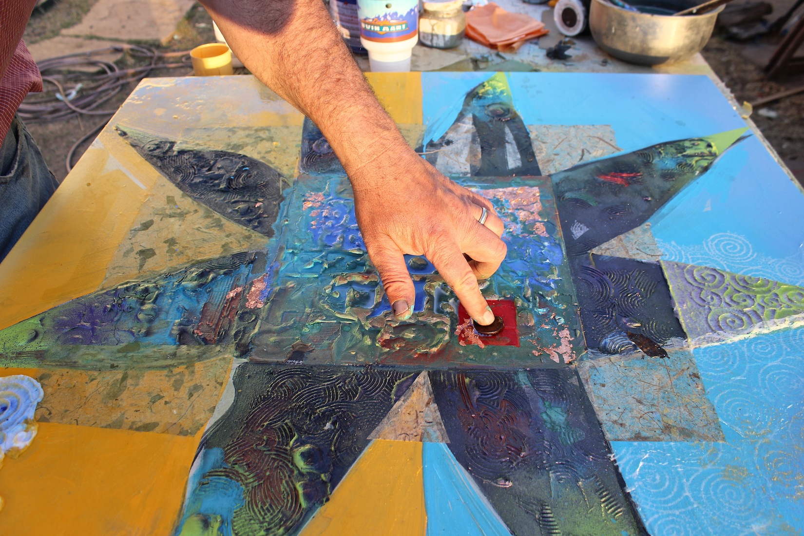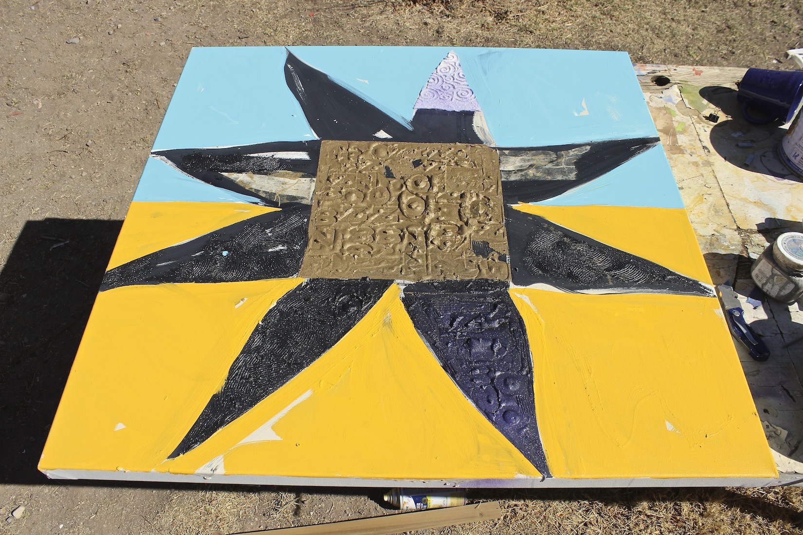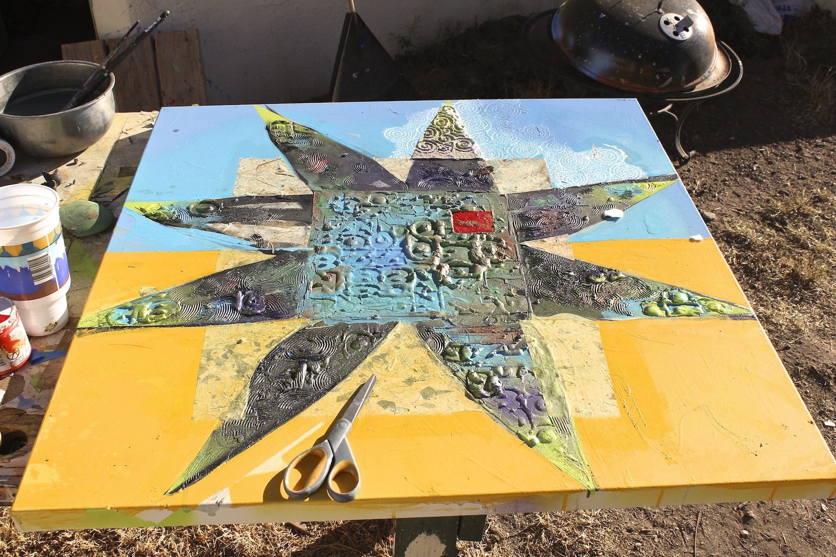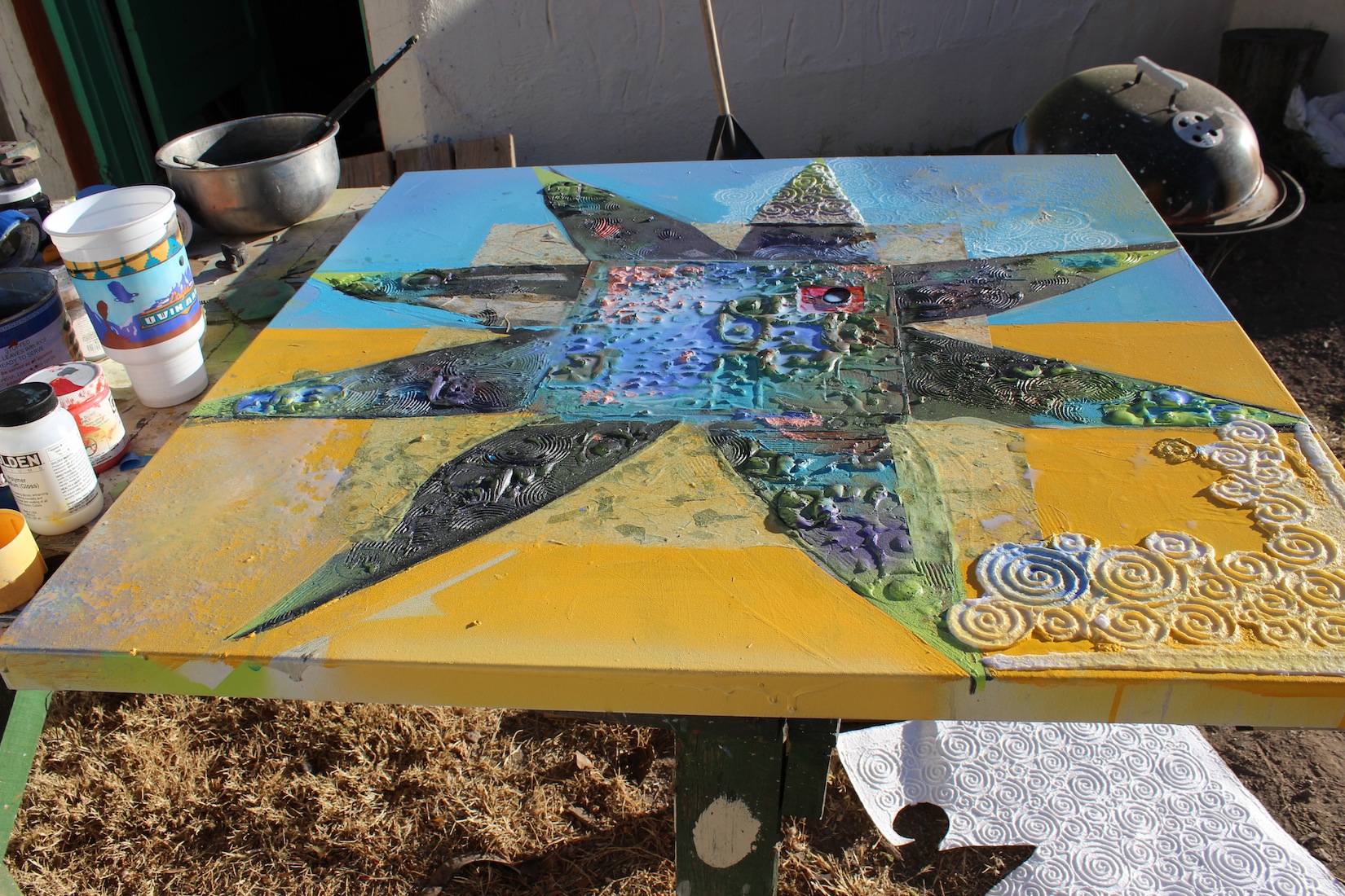 I have wet the yellow and blue corner areas with thinned clear medium and misted them with enamel spray. Misted water will break up the surface giving me a mottled, fairly subtle surface: