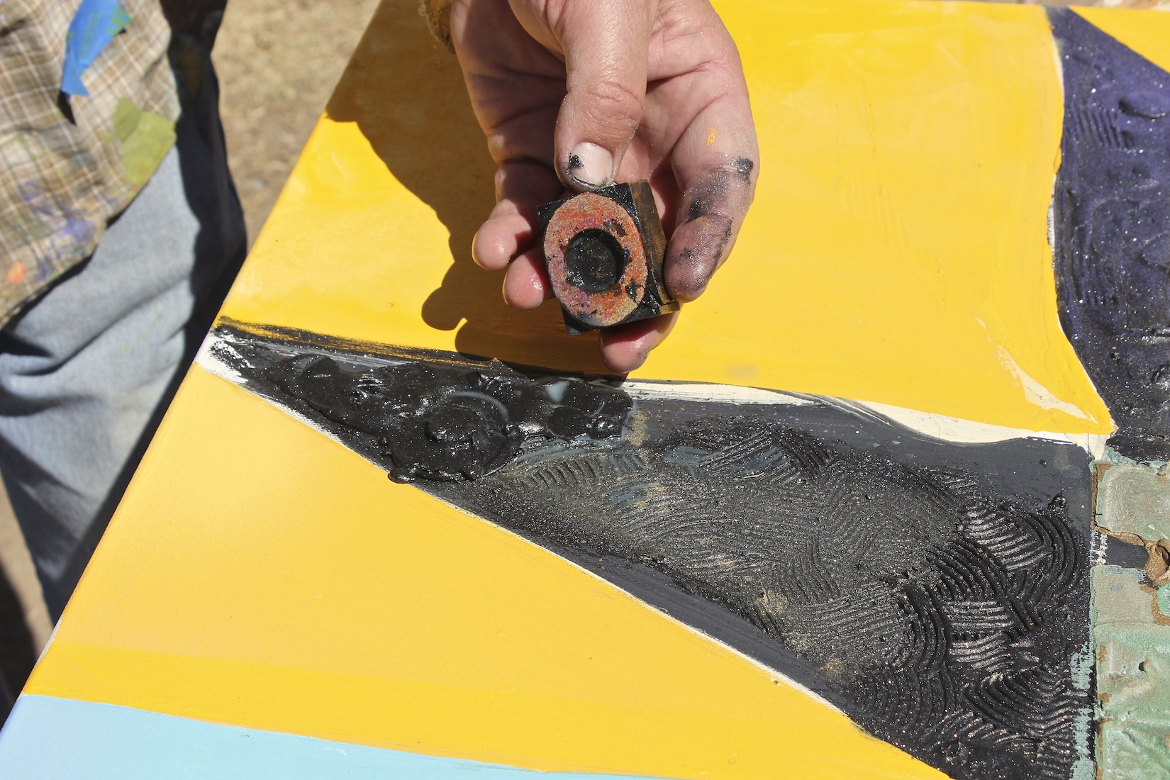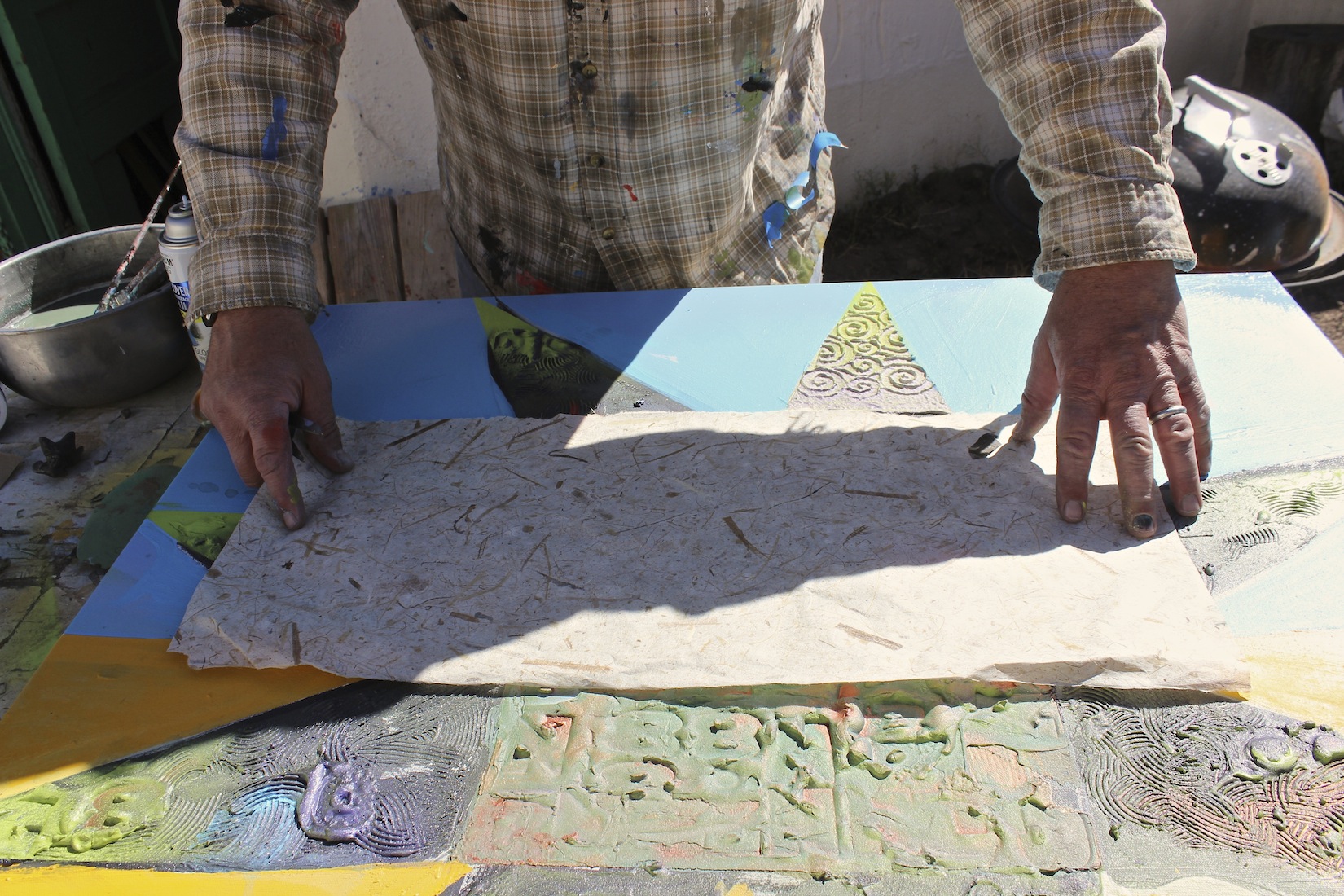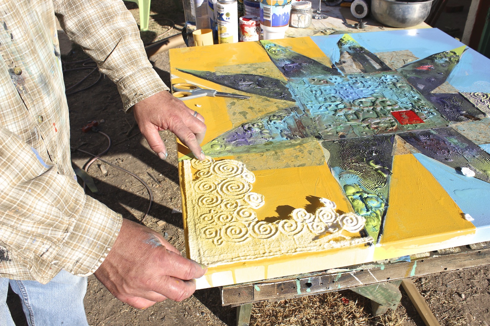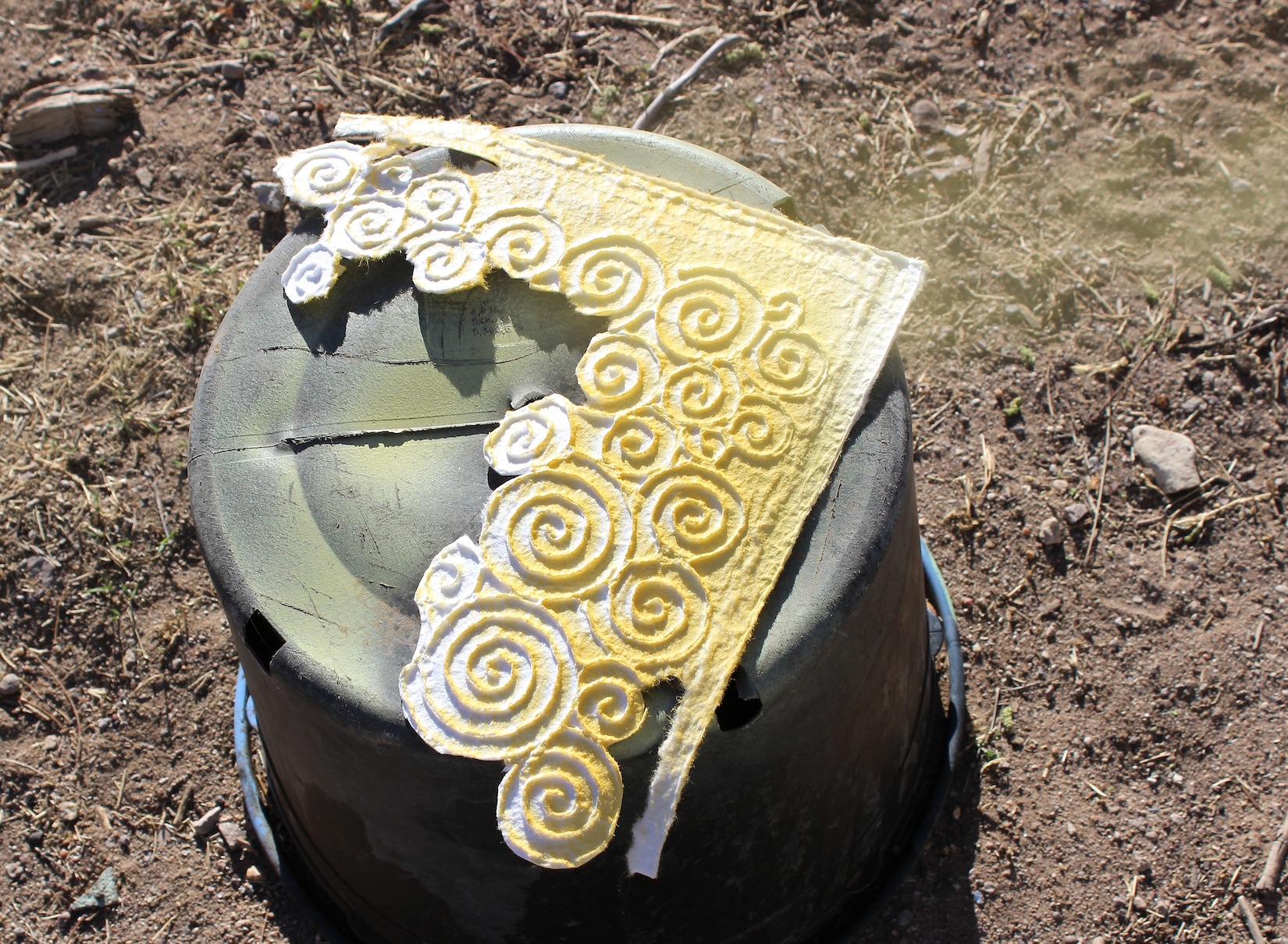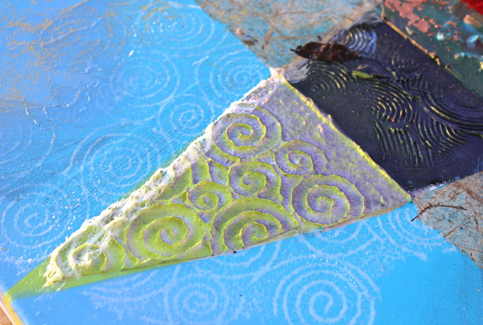 Preparing some spiral textured paper for collaging. You can see some yellow misting off from the right. This color will help ground the collage element, which is a very strong pattern: