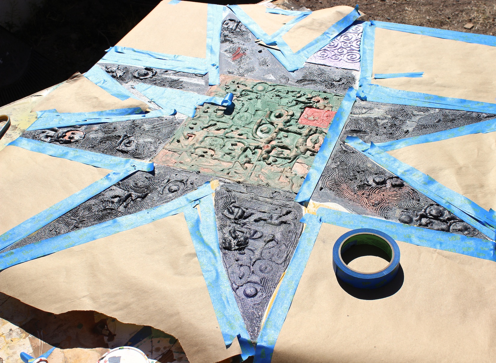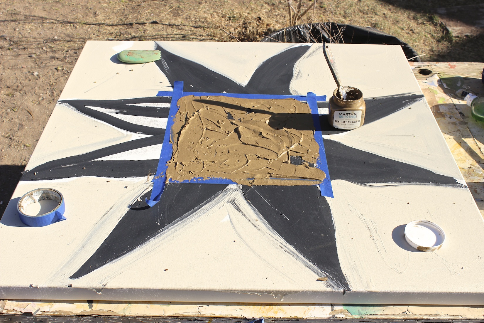Skipping ahead to masking out the ground with kraft paper and blue masking tape. Note that in the interim I’ve done some spot flooding with metallic acrylic and added a red “seal” to the center area.