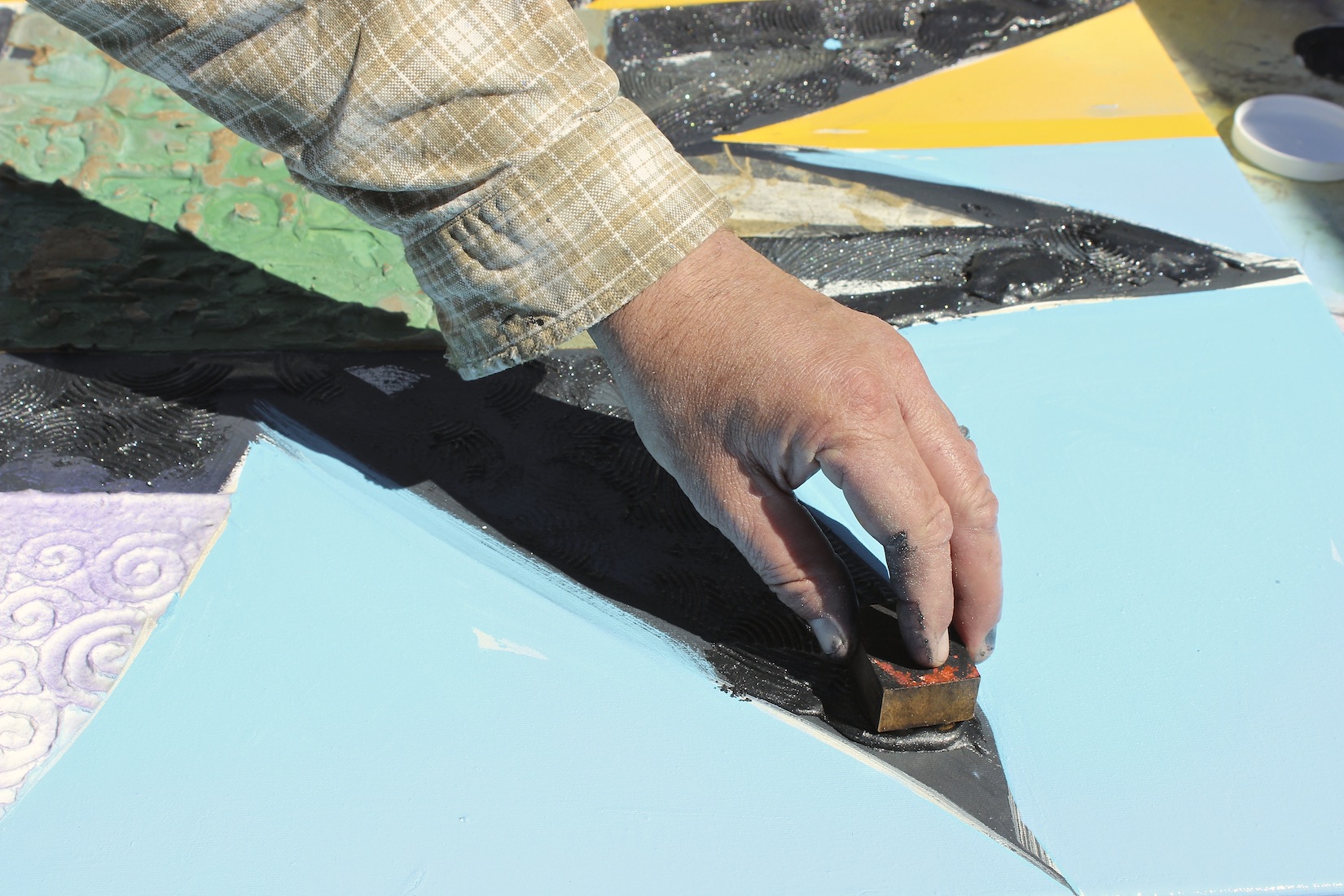 Here comes the sun. Watch those shadows as the work progresses. There is enough variation in surfaces in this one that I was able to work almost continuously while adjacent areas dried. Note the “Martha Living” Textured Metallic ® medium. Not used as Martha intended, but great stuff exclusive to The Home Depot ®.