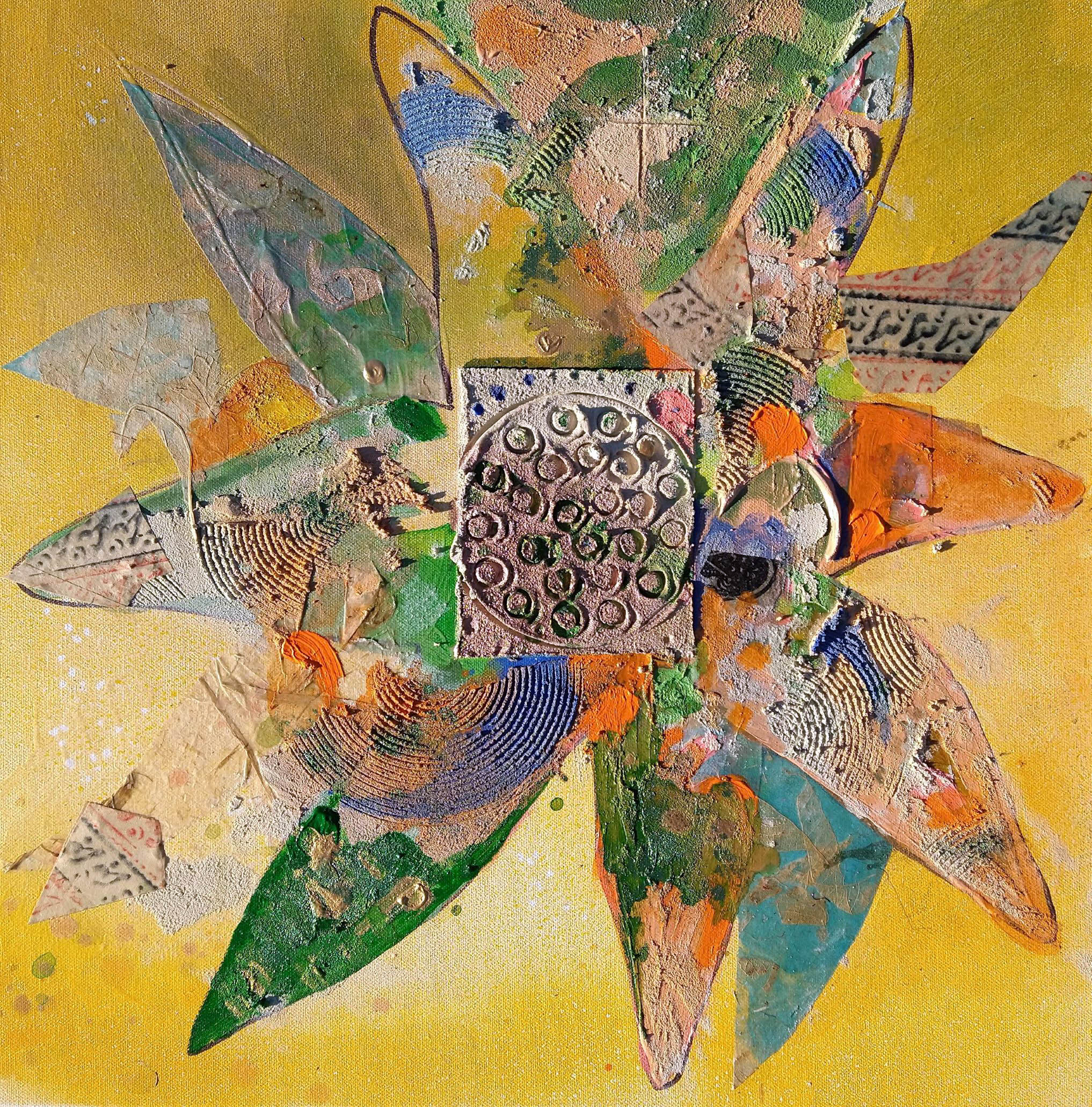 Departure, slight return? 20 X 20,” January 2022. I closed down Dad and Heidi’s studio and returned home to Shady Side with some art materials, including small pre-stetched and gessoed canvas and block-printed papers. The form reminds me of some of Dad’s ( Jim Crane) artwork – less “arabesque” than typical of my “Agave” paintings. Pressed relief very Jim Crane. Color very Carey.
