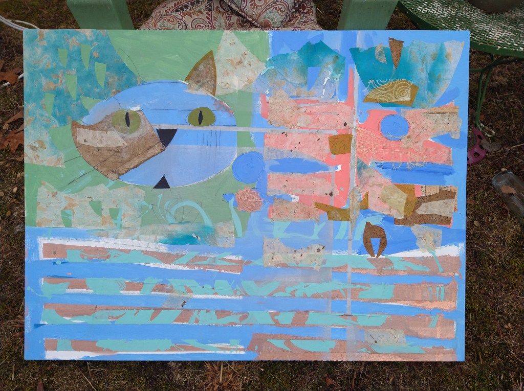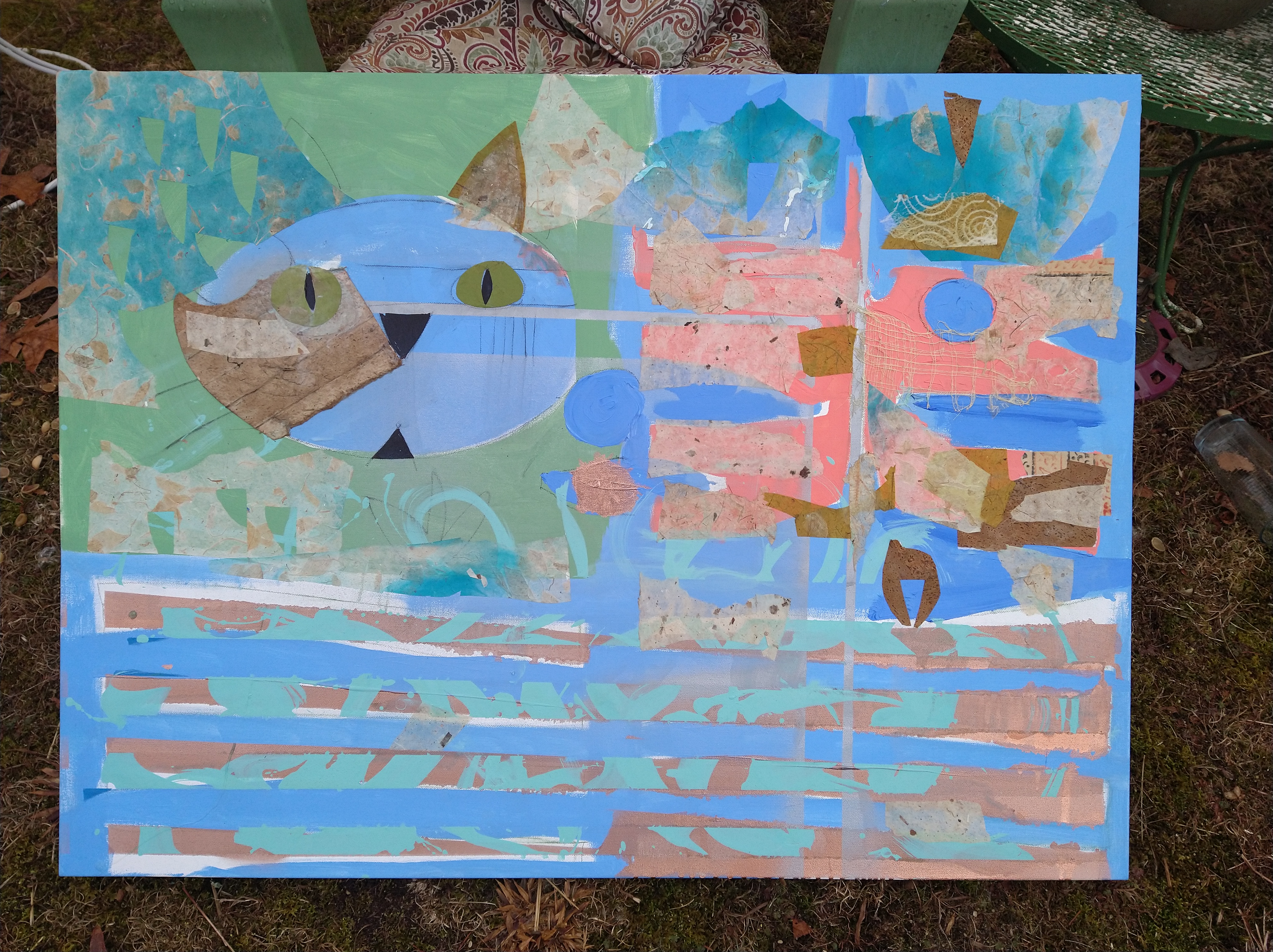 Green-Eyed Cat, She Like Salmon in Her Bowl, second state. Added collage elements – spray enamel on paper. 30 X 40.” Acrylic, and metallic enamel paint, collage on gessoed canvas. Probably completed.