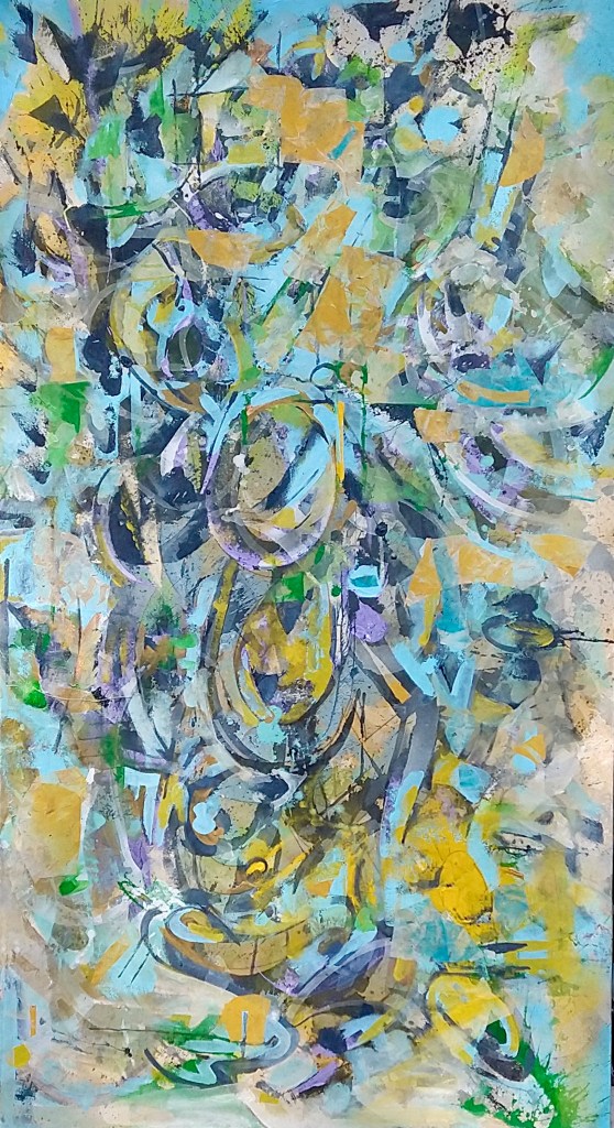 Yesterday mostly, some today. Working back into something started last Fall. Orientation was left side as bottom, May like this vertical orientation. I switch up sometimes, and usually one orientation sets best to my eye. No doubt some Joan Mitchell paintings on my mind. Hello Phthalo Blue light.