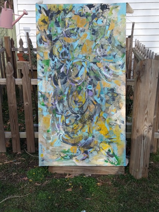 Yesterday mostly, some today. Working back into something started last Fall. Orientation was left side as bottom, May like this vertical orientation. I switch up sometimes, and usually one orientation sets best to my eye. No doubt some Joan Mitchell paintings on my mind. Hello Phthalo Blue light.