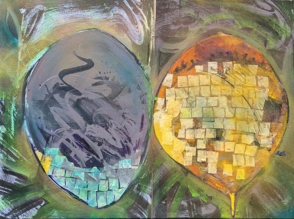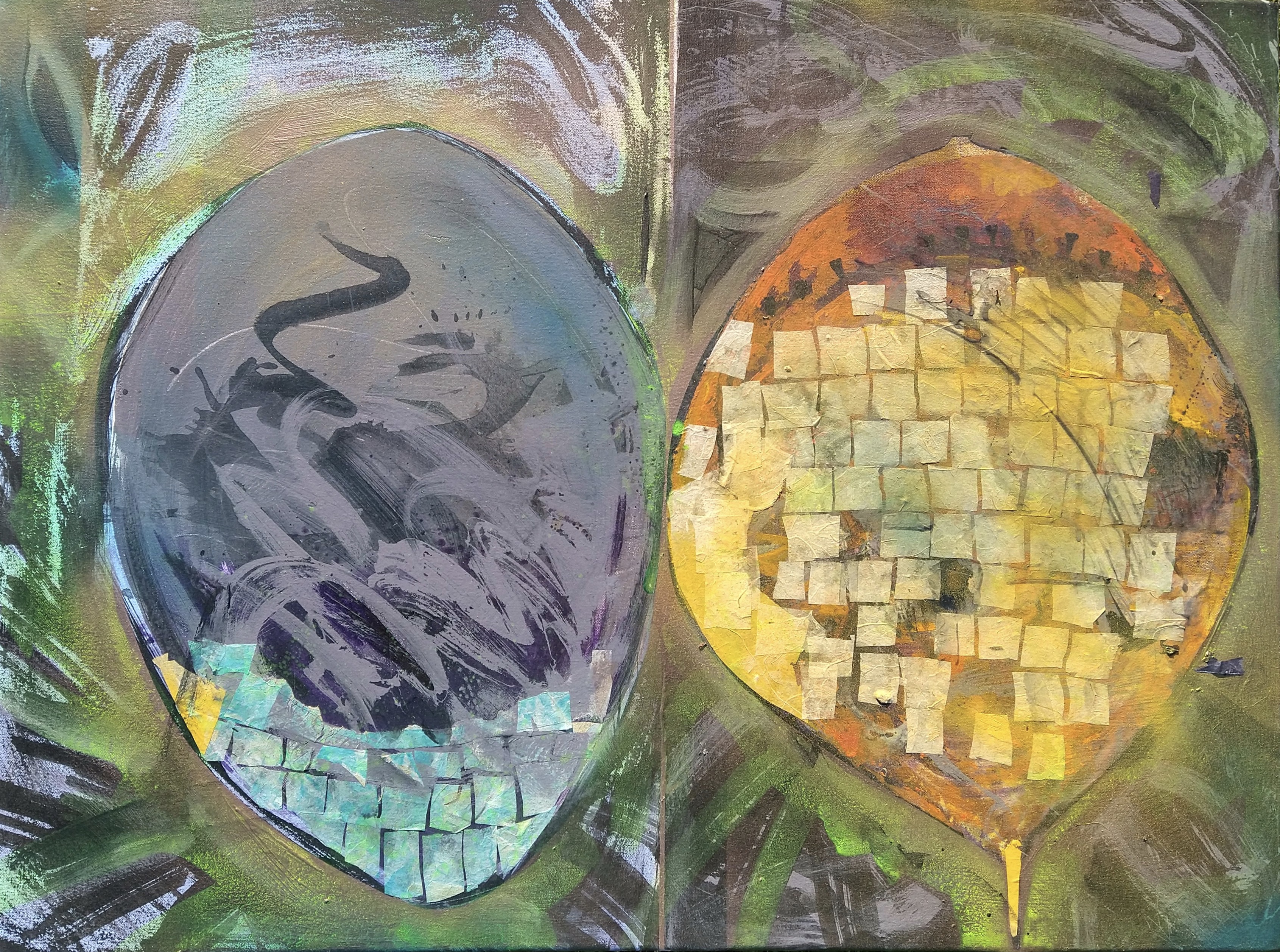 “Stone Soup” 40 X 30″ acrylic, spray enamel, collage on primed canvas.