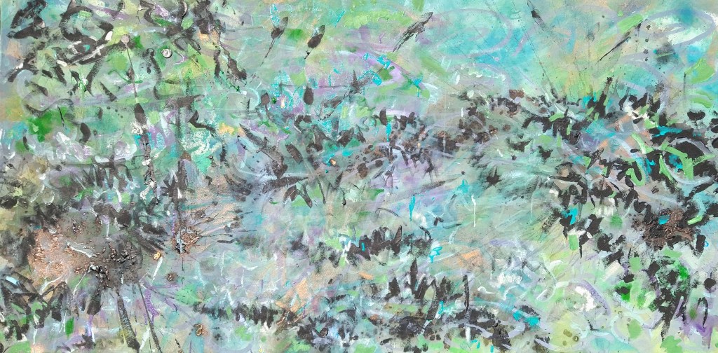 Shore Birds [May] 60 X 30″ Acrylic, Spray Enamel on Unprimed Canvas. Completed? May 21, 2022.