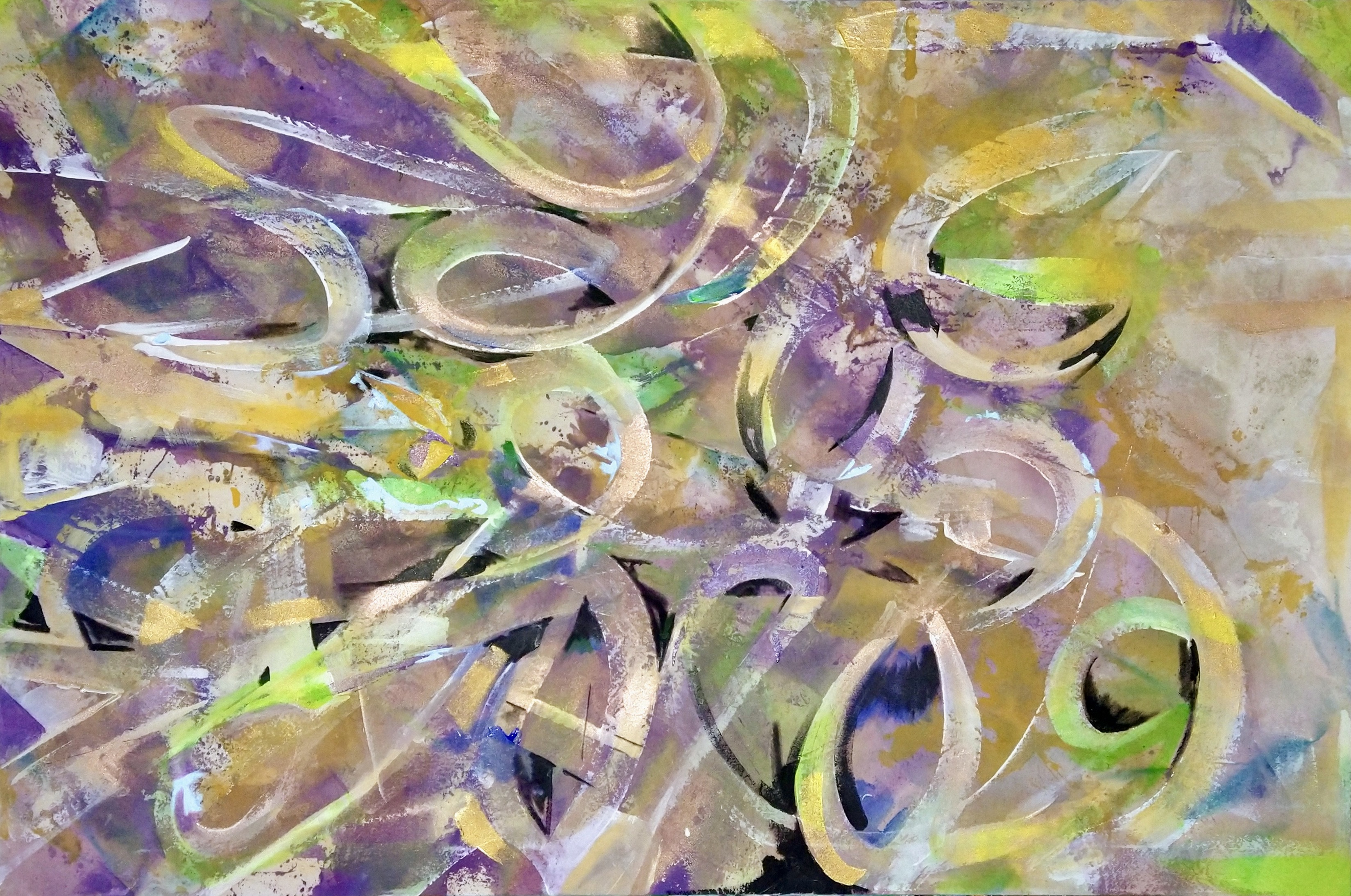 Heatwave. 22 May: Work in Progress. Acrylic and Spray Enamel paint, Gesso Brushed on Unprimed Canvas. ~ 60 X 40.” Shady Side, Maryland