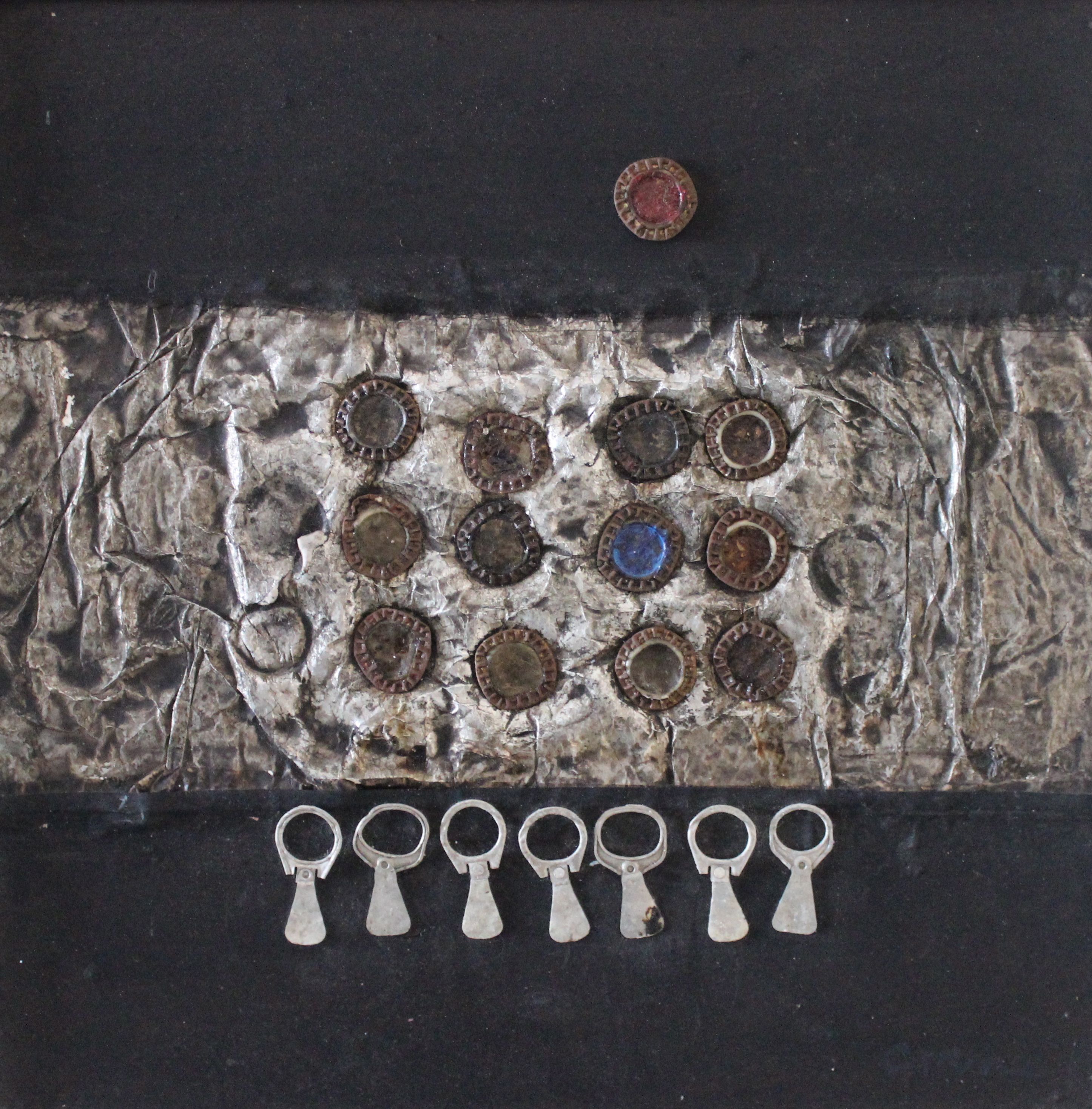 Dad used acrylic paints nearly exclusively after the late 1950s. As for collage materials, he used newspaper and magazines early on, but mostly employed Japanese rice paper and shear fabrics – materials as materials without reference to a previous history or use. He would include small “found objects” on occasion, such as flattened bottle caps and pop-tops.