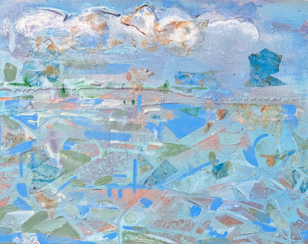 Re-working title “Slight Return.” I “finished ” this painting over ten years ago and showed it at Rio Bravo Gallery in Truth of Consequences, New Mexico. Family drove it as far as Tennessee about eight years ago and we finished the trip to Maryland. It never really held together for me, so here it is reworked, addition/subtraction over the last couple of weekends. It actually looks “fresher” to me. Very unusual that I never signed and dated the back with place of origin. Tells me something. One thing of note is the richness of collage elements. I just don’t have the source of papers that I once had. Still miss New York Central for hand-made papers of the world. Loved that catalog . . . If you know of an extraordinary resource for papers, please share.