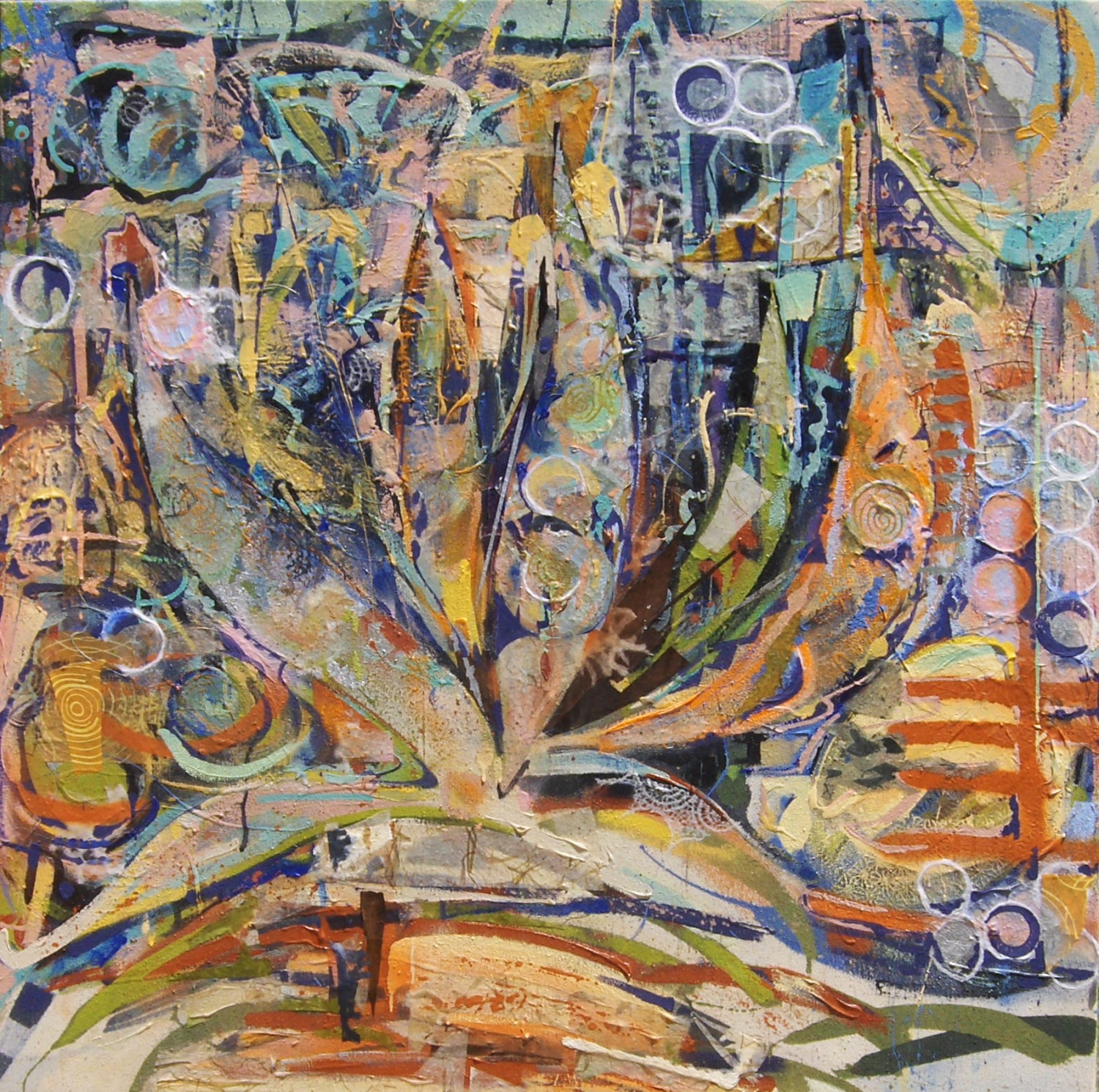 A compendium of apparently free expressionism unified by a dancing agave. Paint and collage mimic one another here.