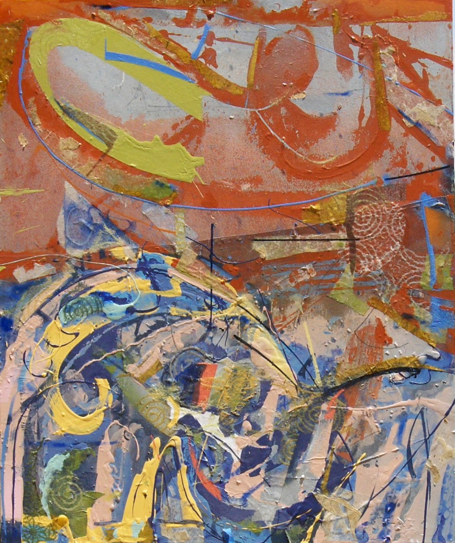 One of those gestural paintings in which characters spontaneously assert themselves. I camouflaged the sad-eyed dog. He kept looking at me and that was all I could see! I sort of regret it now.