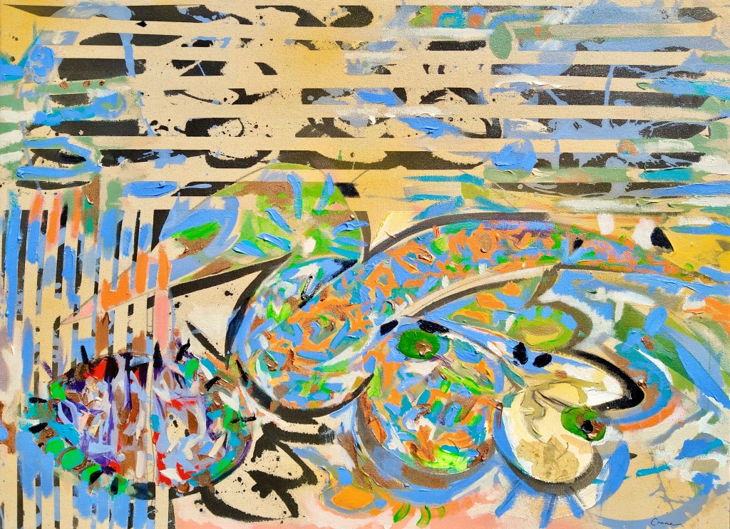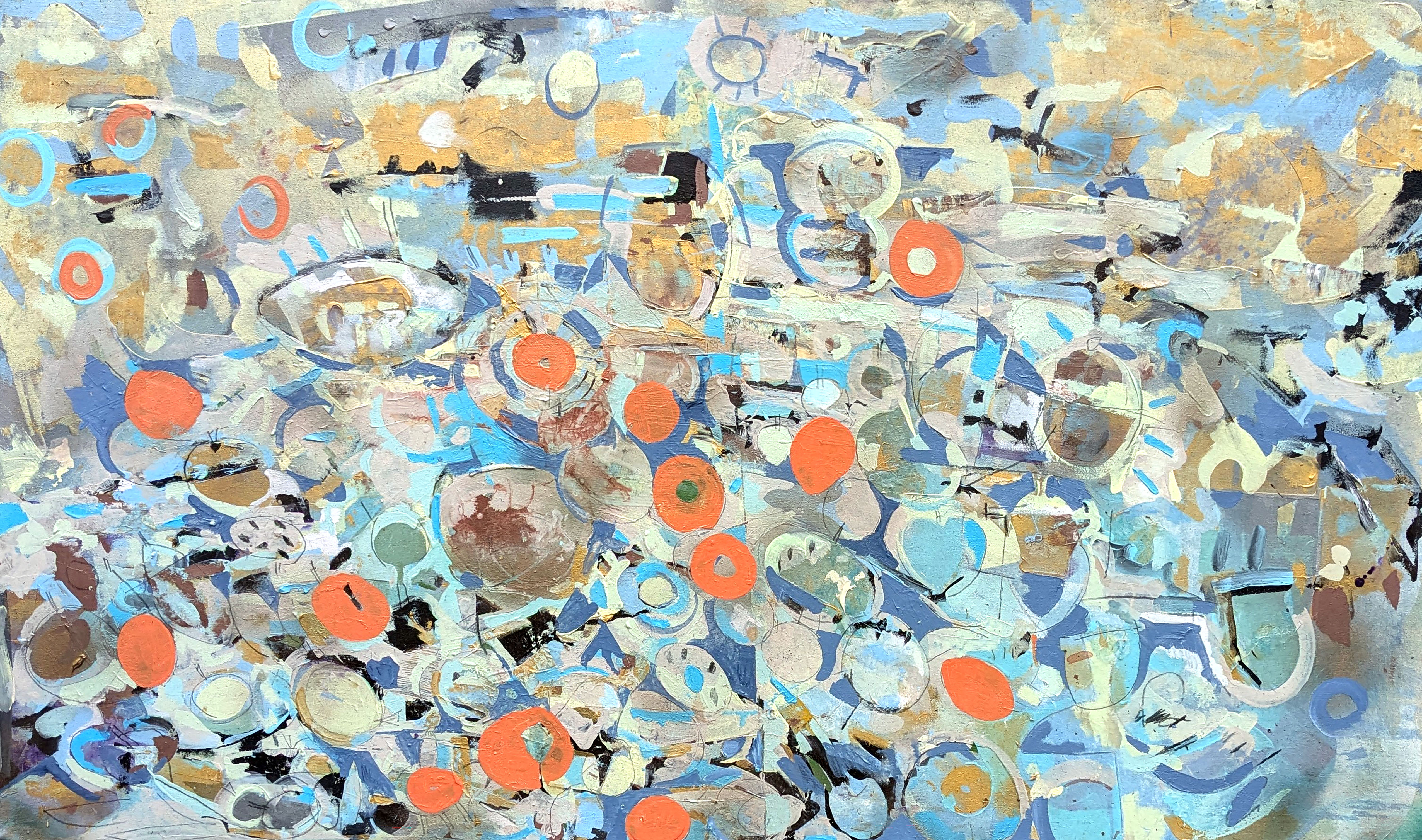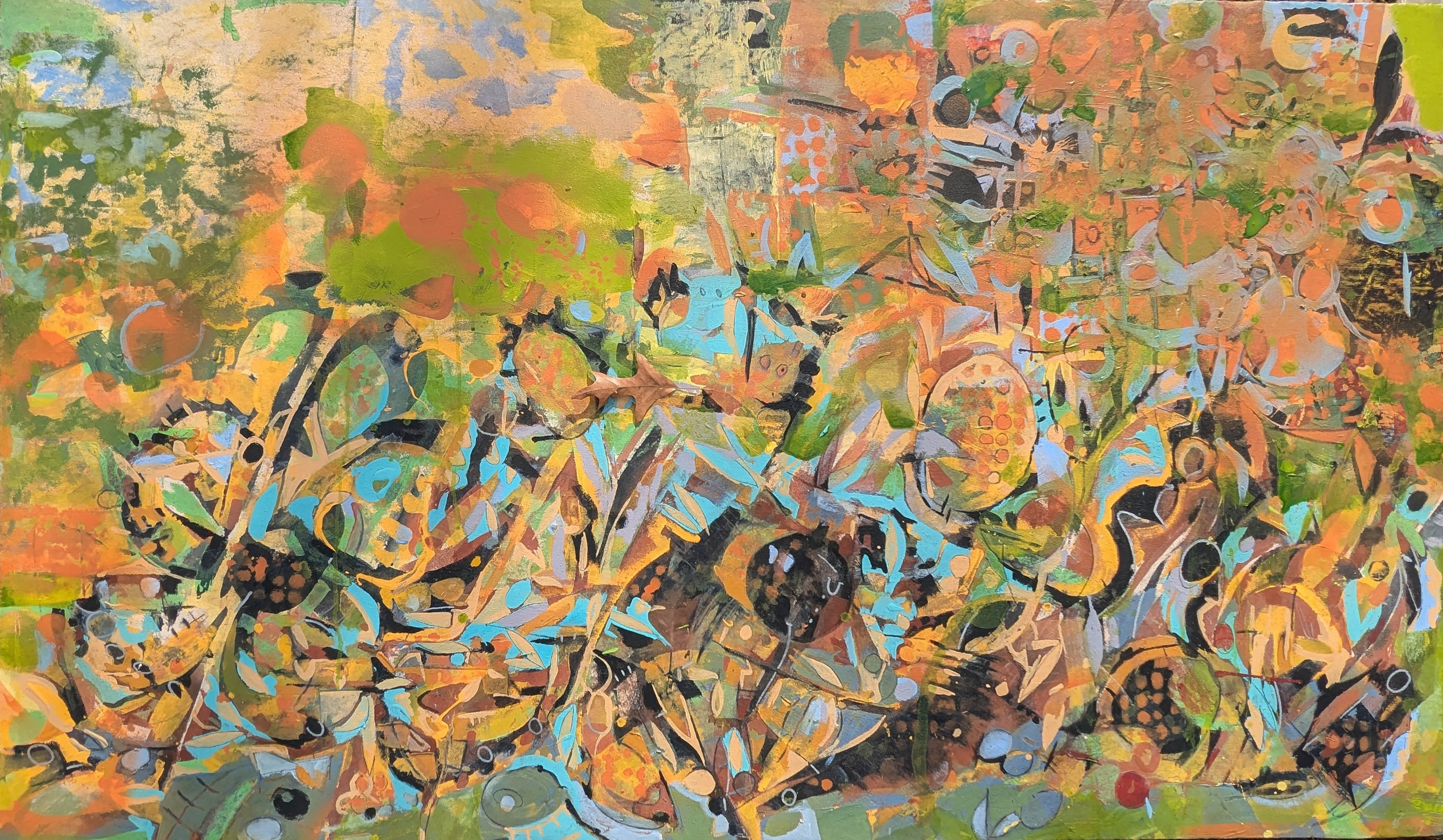 Clementines October ’24. 65 X 38″ Acrylic w/Spray Enamel. (Not on Stretcher.)