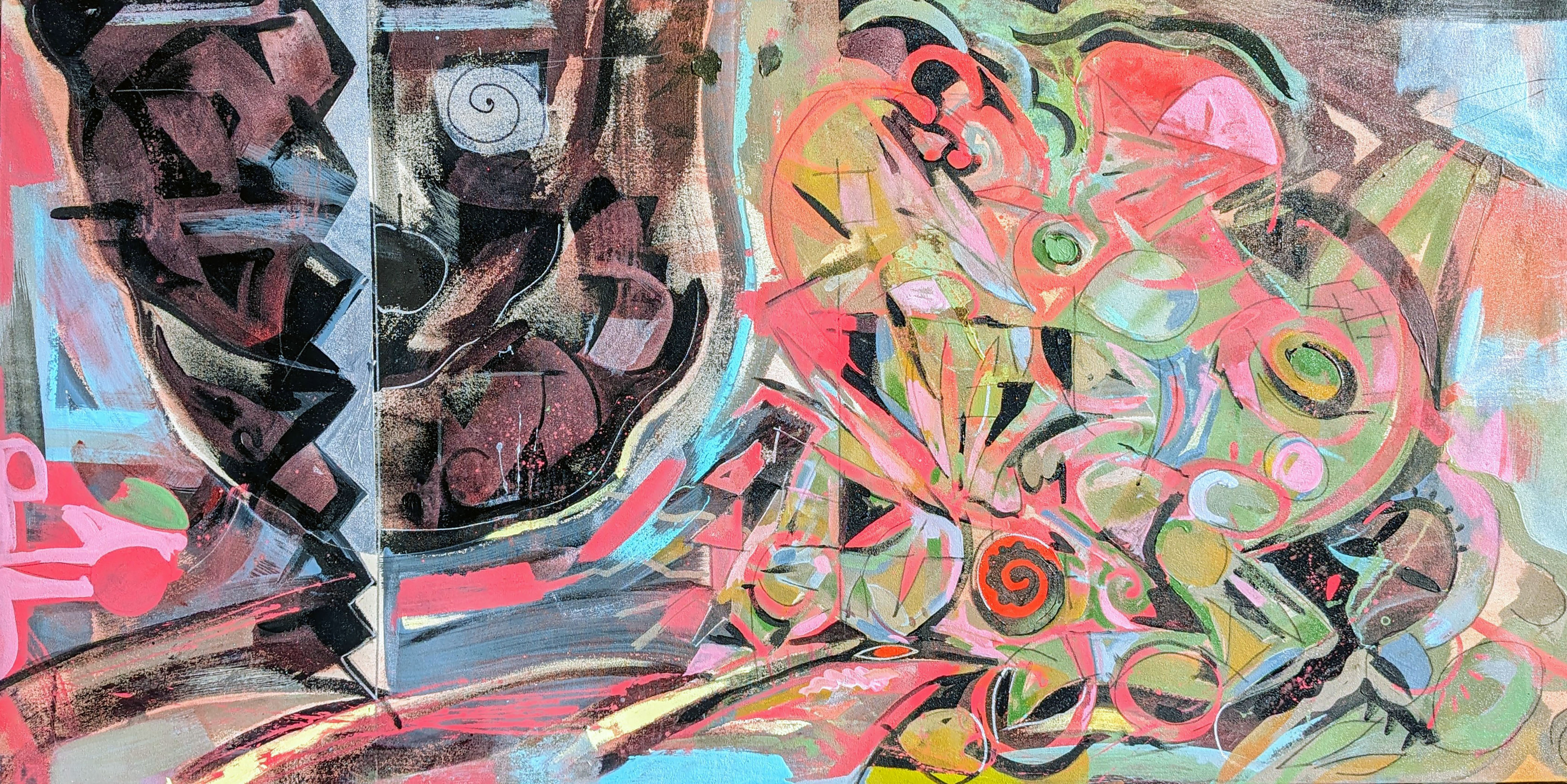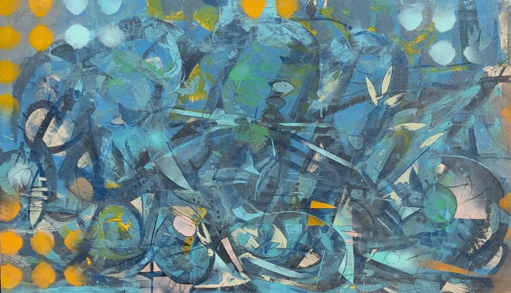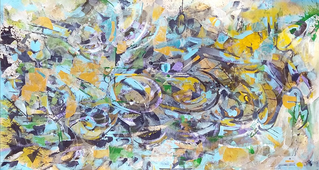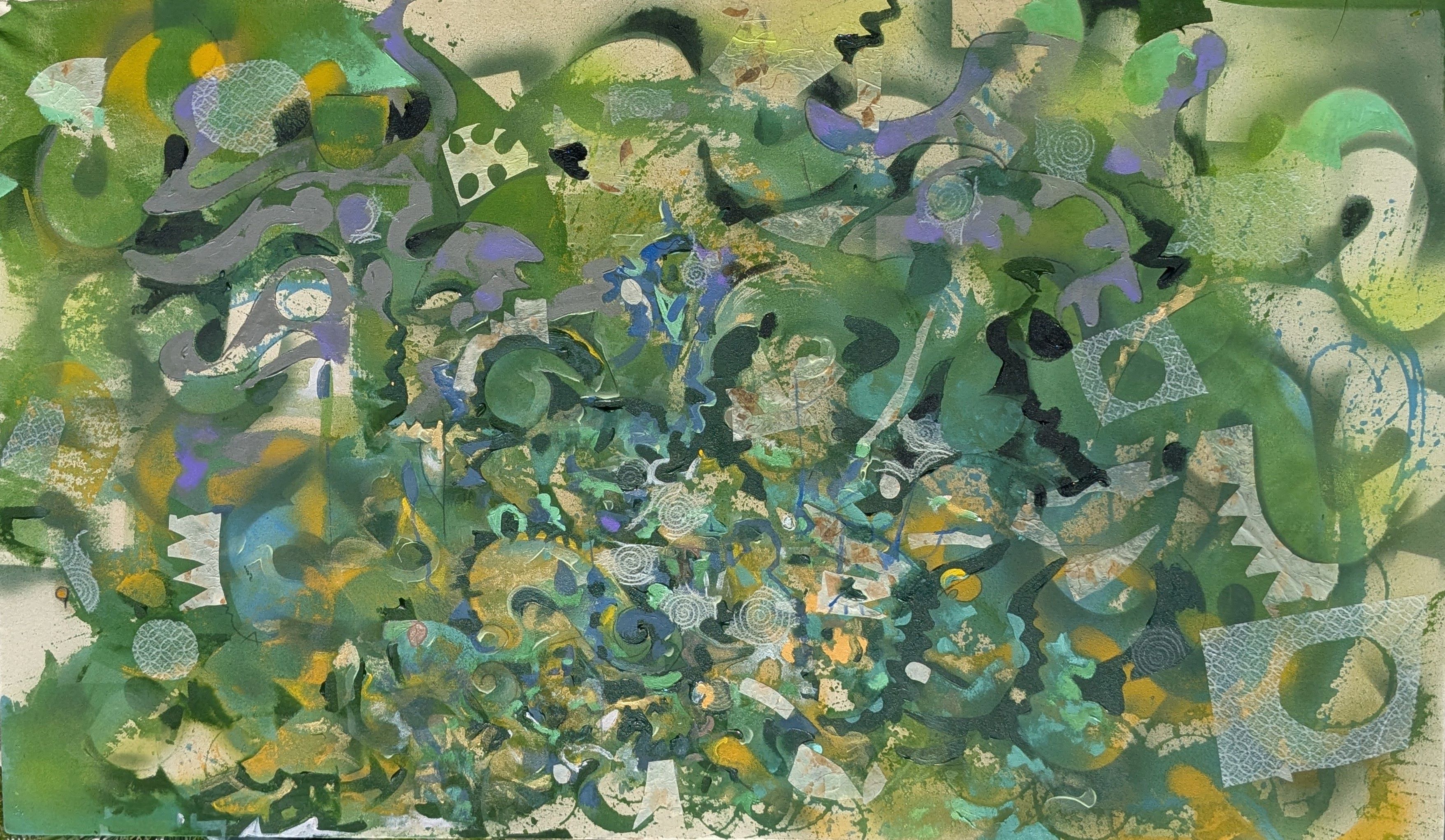 *Chase the Dragon 30 x 48″ Prepared Canvas. Acrylic, Aerosol Enamel, Paper. May 3, ’25