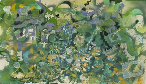 *Verde Loco (June Bug) 65 x 38″ Acrylic on raw canvas, aerosol enamel, paper