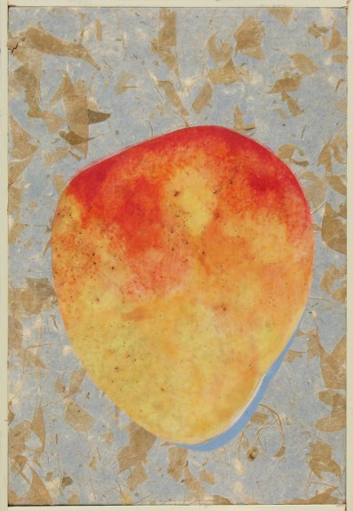 Acrylic glazing, mango leaf paper collage on panel, ~9×13″