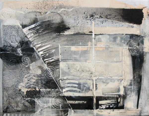 Alamogordo, NM, ca. 2007 Acrylic/collage/silver enamel on panel, 16 x 20” On exhibit at the Unsettled Gallery, Las Cruces